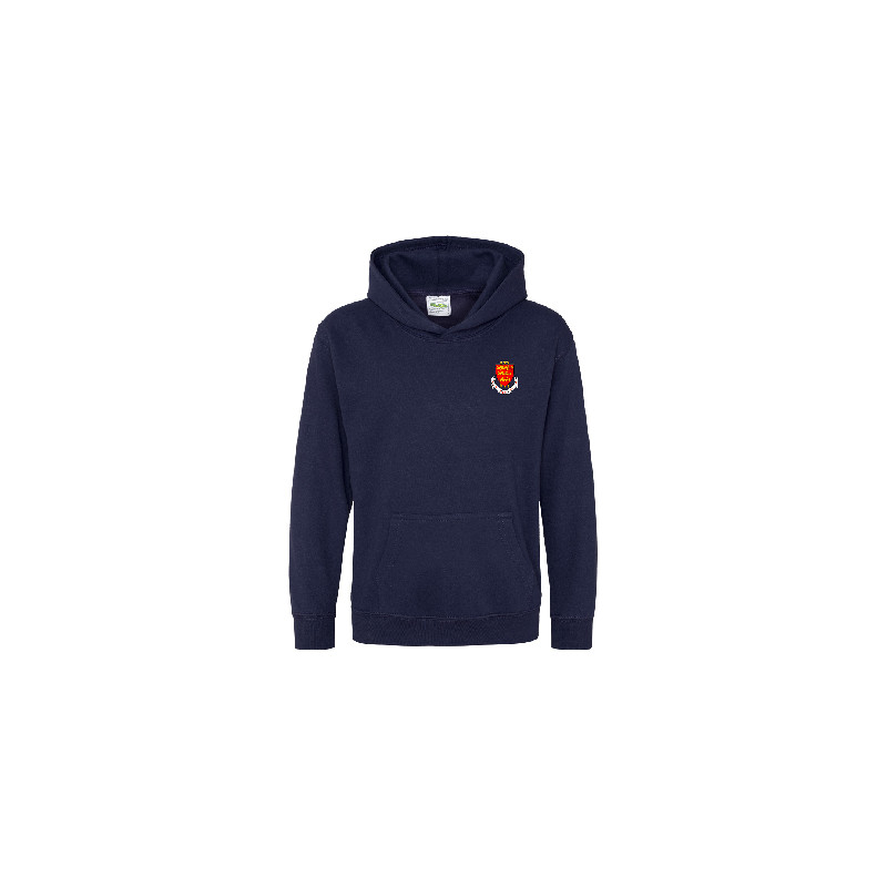 JH01J AWDis College Hoodie embroidered with the Odiham & Greywell Cricket Club Logo. Over the head style hoodie in navy. Age 3-4 to Age 12-13 (Details below)
