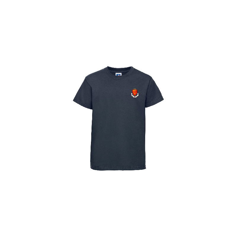 180B Russell Schoolgear Kids Classic Ringspun T-Shirt embroidered with the Odiham & Greywell Cricket Club Logo. 100% ringspun cotton in navy. Age 3-4 to Age 11-12 (Details below)